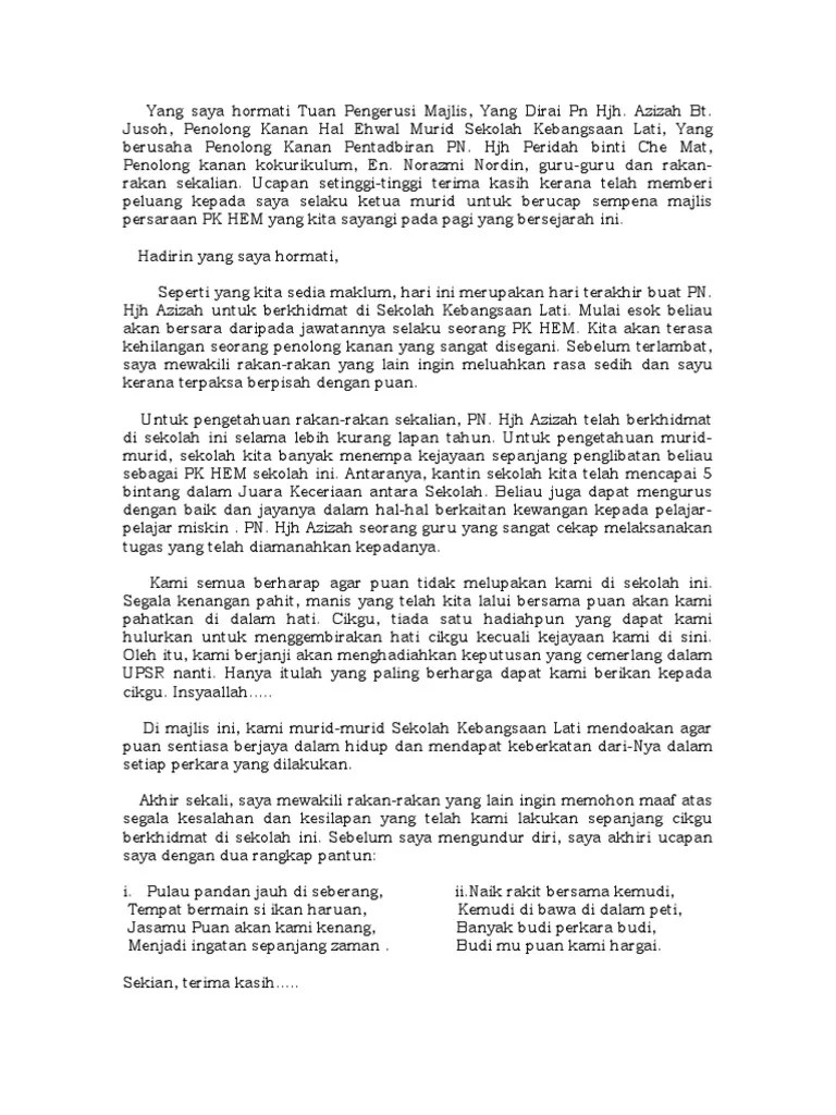 Majlis perpisahan dan persaraan en muhamad dan cik tengku norhadzan sk keratong 4. Mutiara kata persaraan guru cikimm com. Ucapan ydp pibg sempena persaraan guru besar. Teks ucapan wakil murid sempena persaraan guru.
